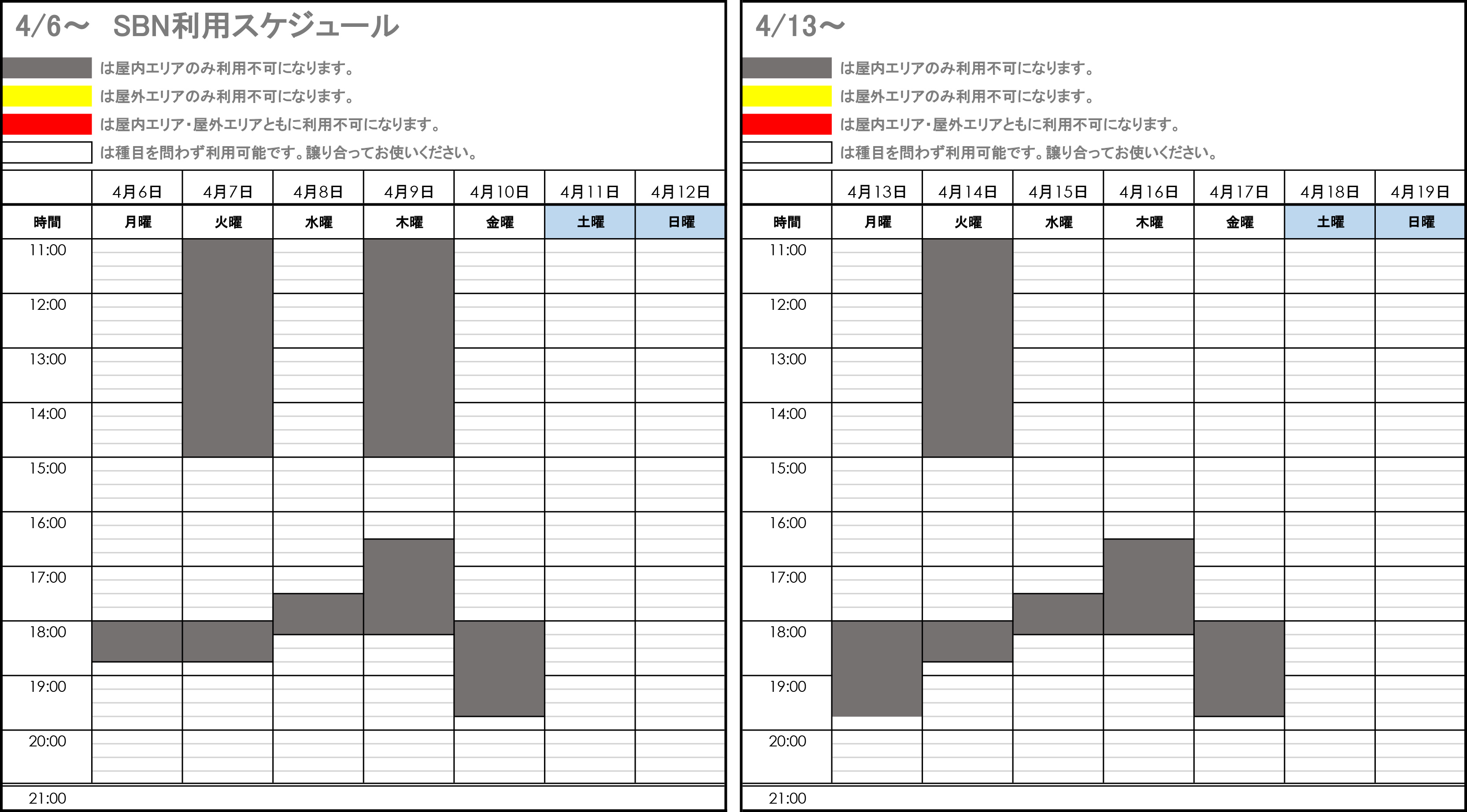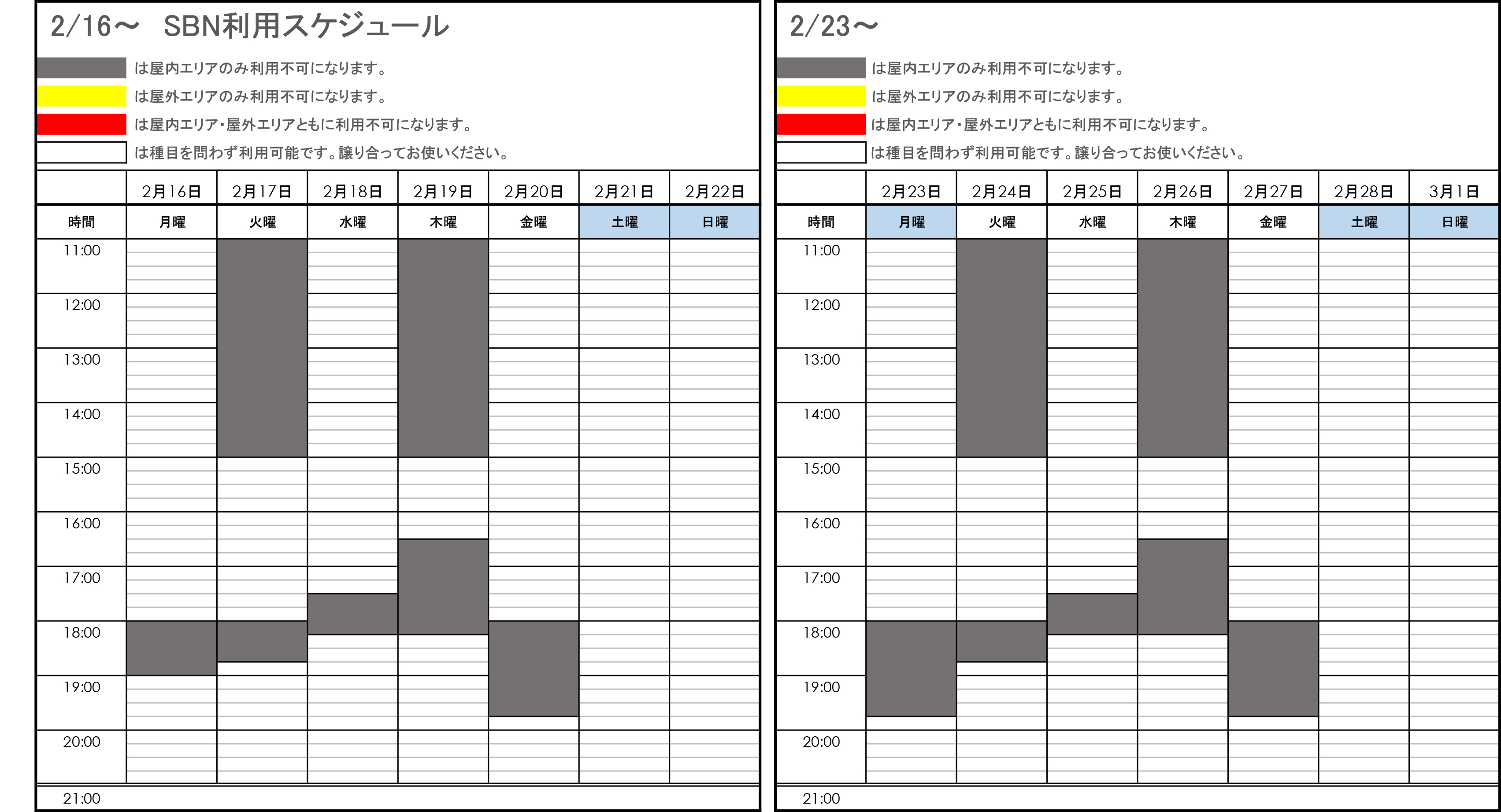 - SBNの利用可能時間は11:00~21:00です。