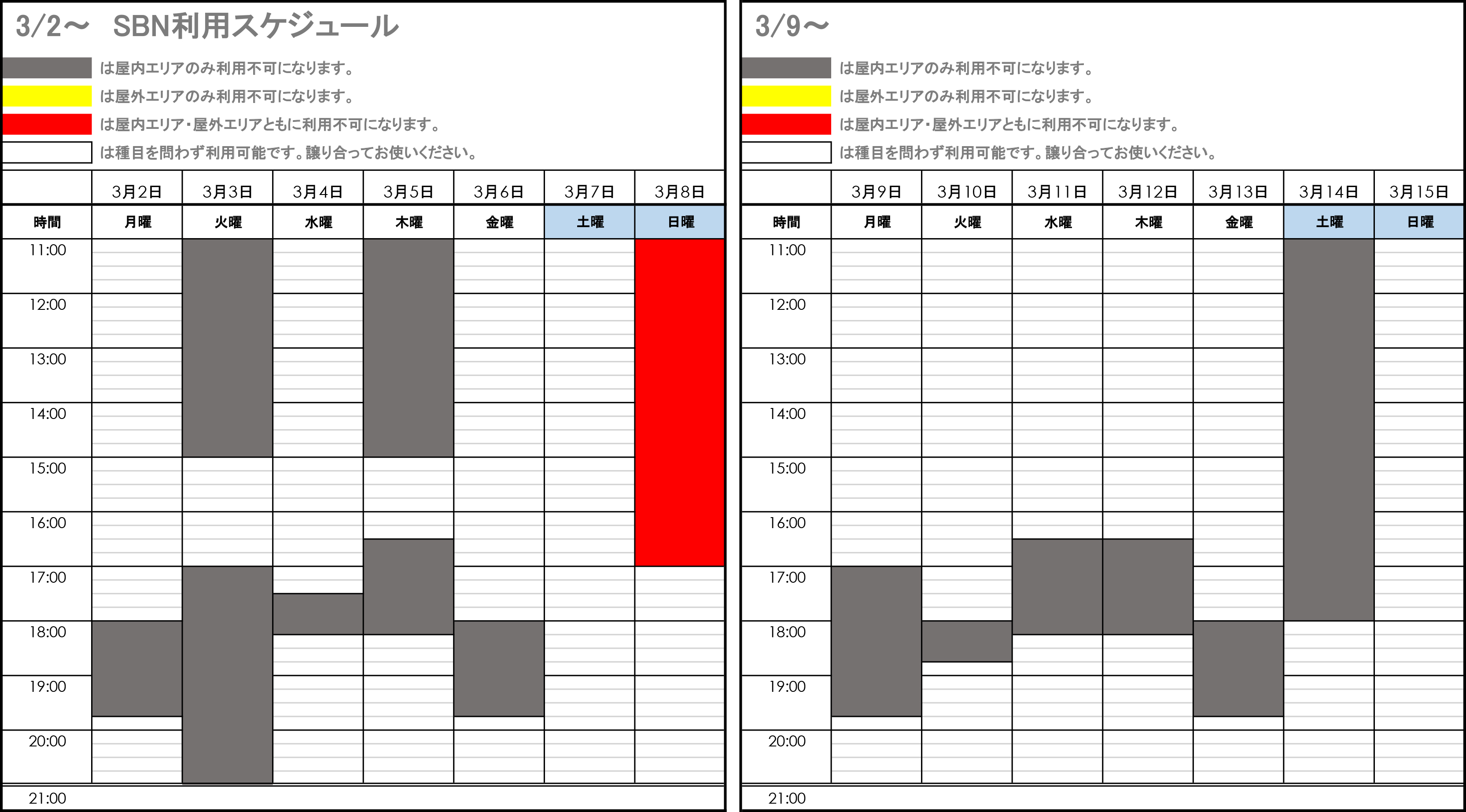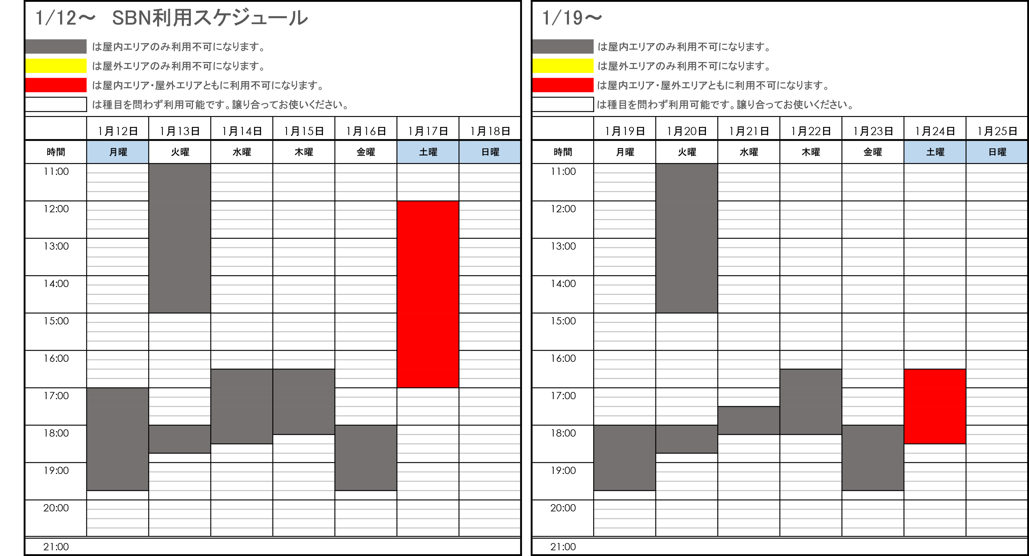 - SBNの利用可能時間は11:00~21:00です。