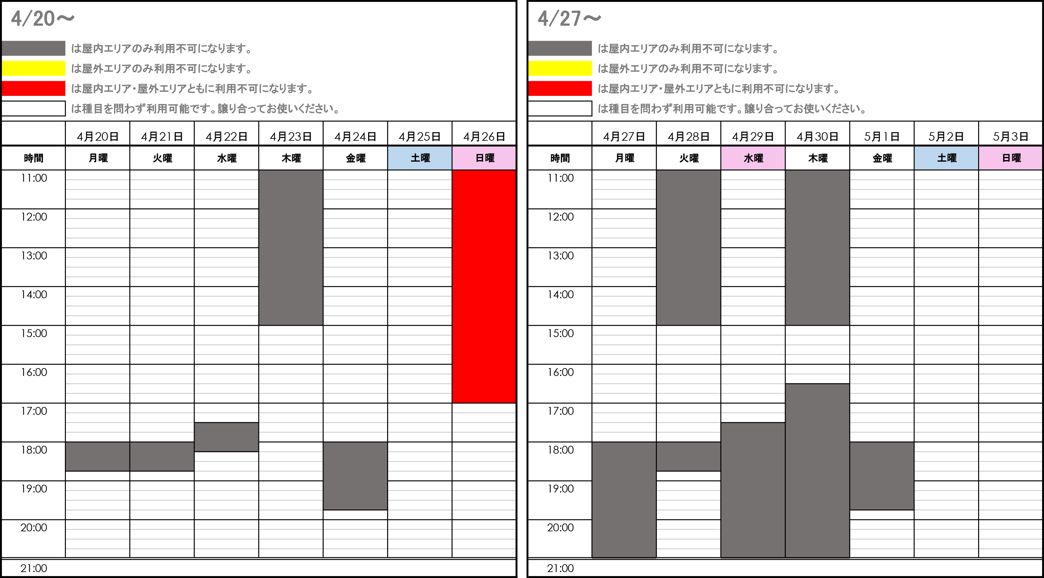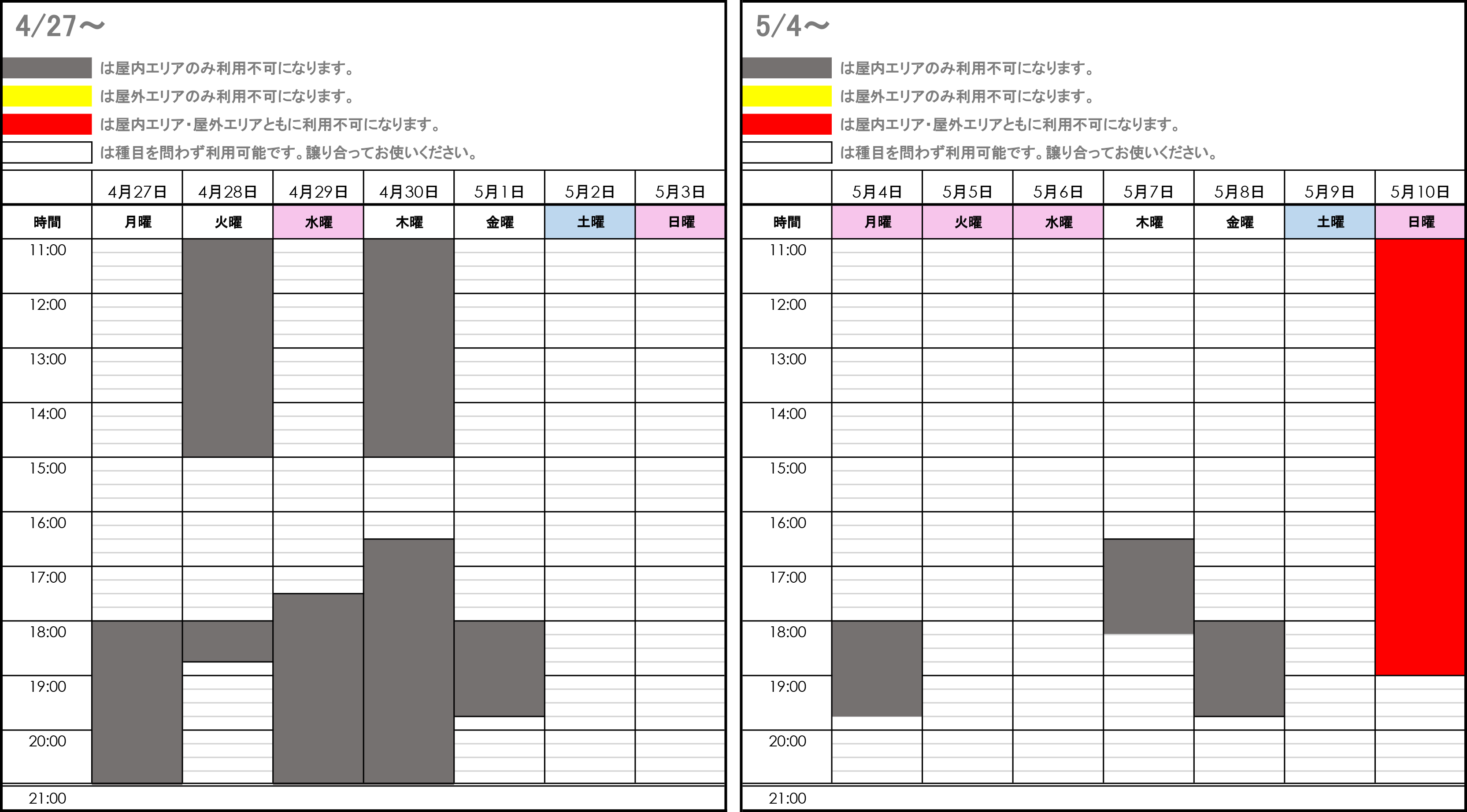 予約不要、無料でご利用いただけますが、スクールやイベント開催時等、ご利用いただけない時間帯がございます。